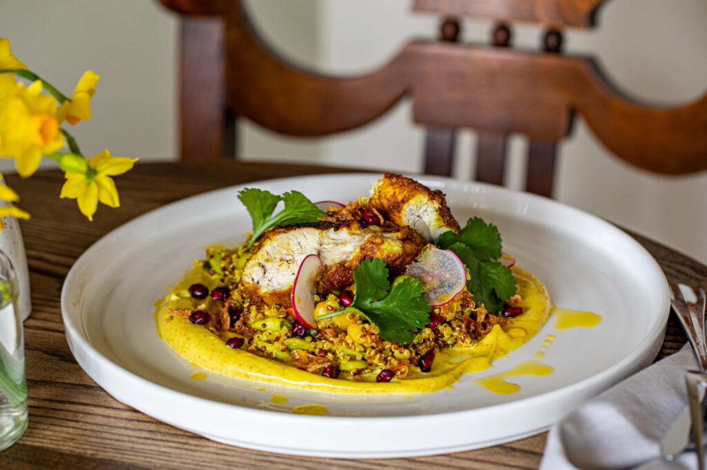 Grilled goat’s cheese, Waldorf salad, hazelnuts, thyme honey, toasted sourdough (v) | 9.5 534 kcals