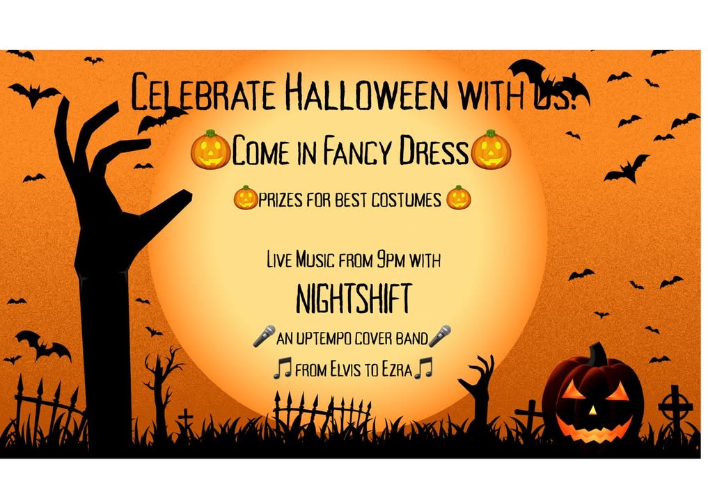 💀Come in fancy dress, with prizes for the best dressed! Why not enjoy a bite to eat & then enjoy the live music with Nightshift from 9pm 🎵💀